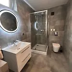 Die privaten Badezimmer sind mit Badelaken ausgestattet und stellen eine getrennte Toilette und eine Dusche zur Verfügung. Die Aussicht auf den Garten ist ein großer Vorteil.